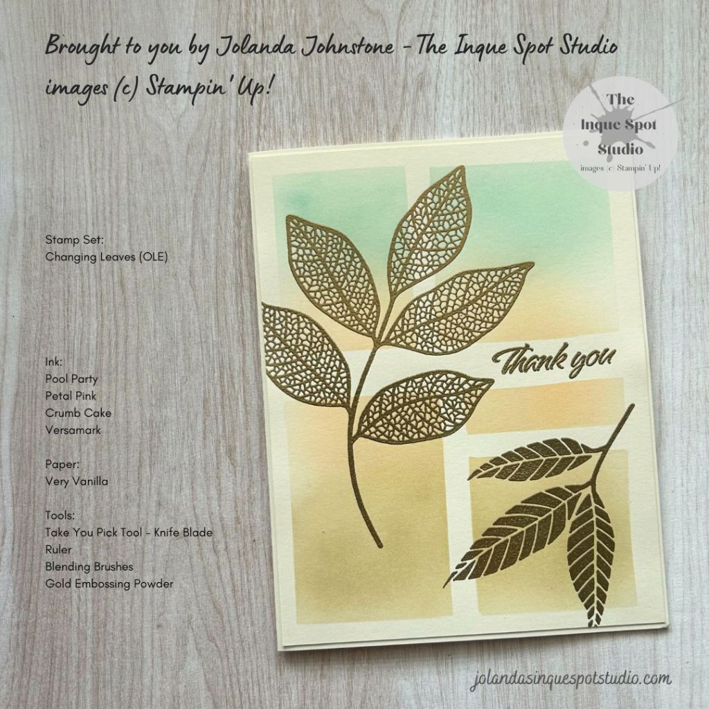 - The large Leaf, medium Leaf and Thank you sentiment, from the Changing Leaves stamp set, an On-Line Exclusive product, were all stamped with Versamark ink and heat-set with Gold Embossing Powder.