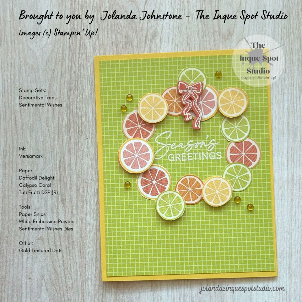 - Focal Image – Wreath: Citrus Slices were fussy-cut with Paper Snips from the Citrus patterned piece of paper, also from the Tutti Frutti Designer Series Paper pack.