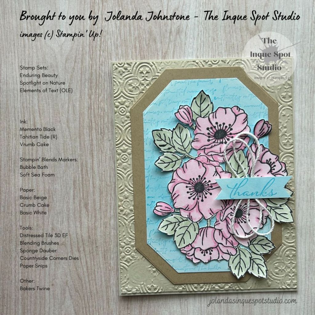 • The Floral image from the Enduring Beauty stamp set was stamped with Memento Tuxedo Black ink and colored with Stampin’ Blends Markers.  Colors chosen: Light and Dark Bubble Bath and Soft Sea Foam.