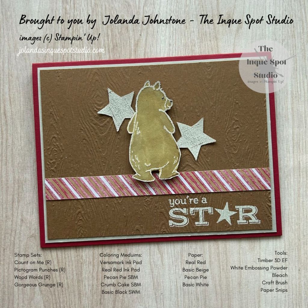 • The Bear image from the retired Count on Me stamp set was stamped with Versamark ink and heat-set with White Embossing Powder.
