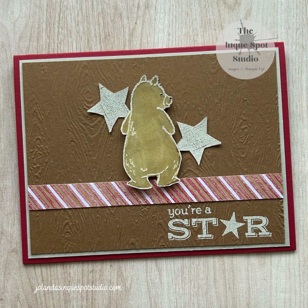 • The Bear image from the retired Count on Me stamp set was stamped with Versamark ink and heat-set with White Embossing Powder.