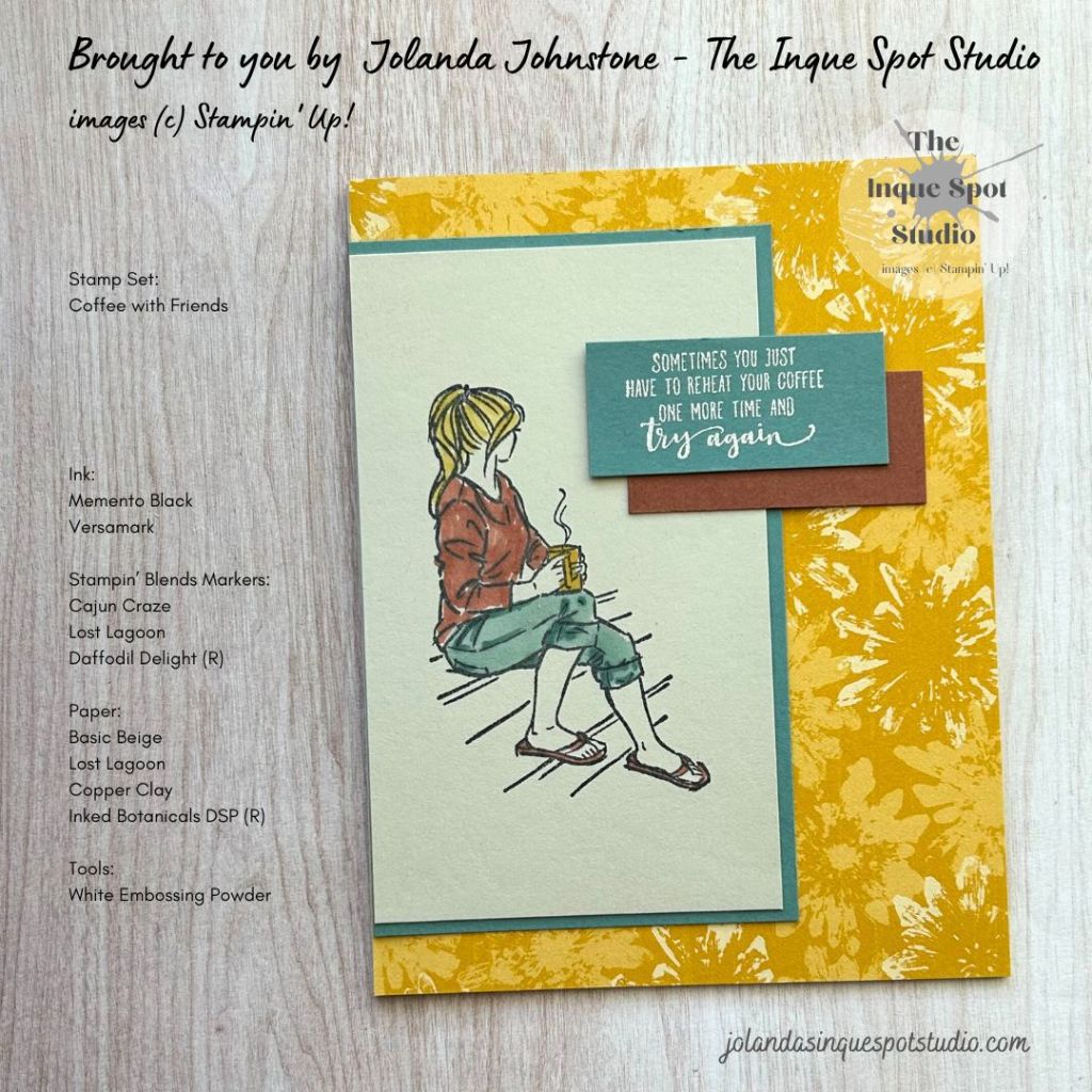 • The Girl on the Steps image from the Coffee with Friends stamp set was stamped with Memento Tuxedo Black ink and colored with Stampin’ Blends Markers.  Colors chosen: Hair – Medium Daffodil Delight retired Stampin’ Blendabilities Marker; Top / Flip Flops – Light Cajun Craze; Jeans – Light and Dark Lost Lagoon, and Coffee Cup – Dark Daffodil Delight retired Stampin’ Blendabilities Marker.