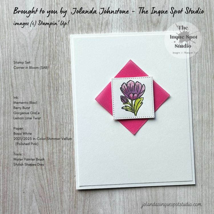 - The single Floral image from the Corner in Bloom stamp set, a Sale-a-bration free optional choice with a qualifying purchase, was stamped with Memento Tuxedo Black ink and water-colored using the Fine-Tipped Water Painter Brush with ink picked up for the Ink Pad Lids. Colors chose: Bloom – Berry Burst and Gorgeous Grape and Leaves – Lemon Lime Twist.