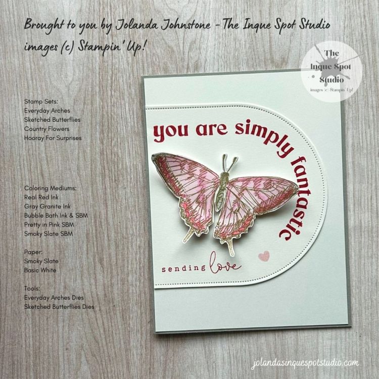 - The Large Butterfly image, from the Sketched Butterflies stamp set was stamped with Gray Granite ink and colored with Stampin’ Blends Markers. Colors chosen: Wings – Light and Dark Bubble Bath and Light Pretty in Pink; and Body – Light Smoky Slate.