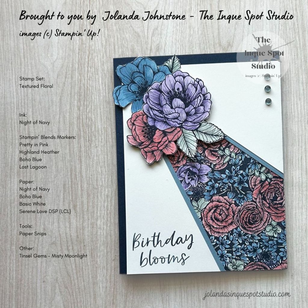 - The sentiment, Birthday Blooms, from the Textured Floral stamp set was stamped with Night of Navy ink on the “left” triangle piece.