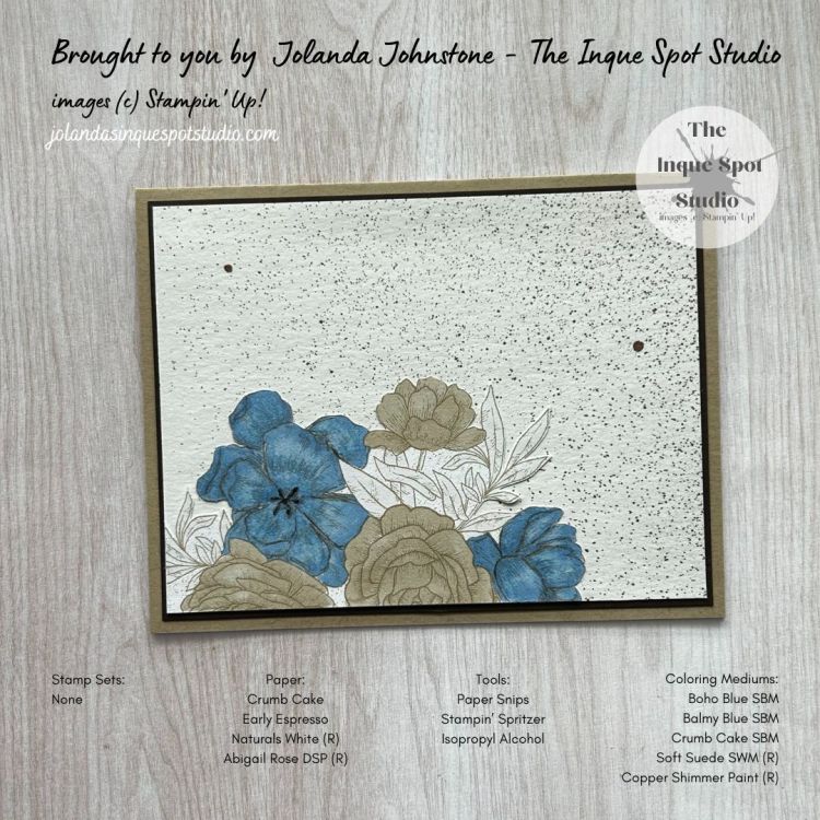 - A corner was clipped with Paper Snips and colored with Stampin’ Blends Markers. Colors chosen: Blue Flowers – Light and Dark Boho Blue blended with Light Balmy Blue and Light Brown Flowers – Light Crumb Cake.