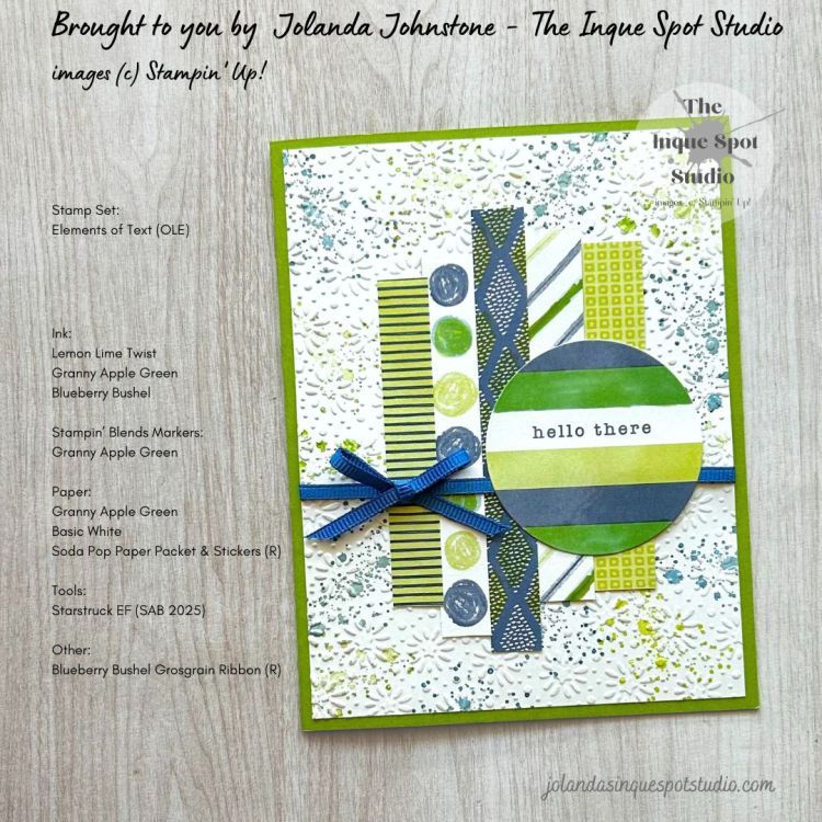 • The Splatter image from the Elements of Text stamp set, an On-Line Exclusive product, was stamped with Lemon Lime Twist, Granny Apple Green and Blueberry Bushel inks.