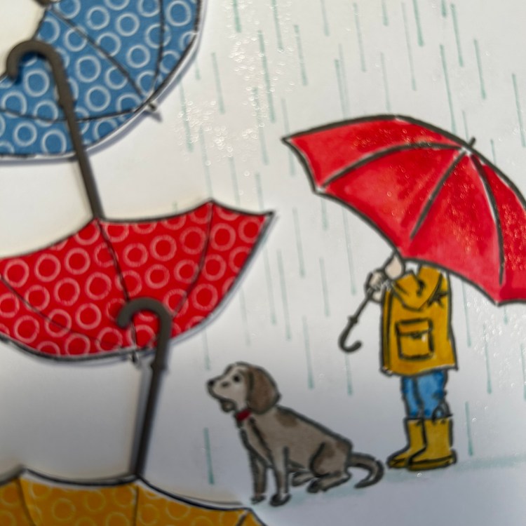 All elements were adhered to the card base to resemble the sketch. The three topsy-turvy windblown Umbrellas were popped up with Dimensionals.