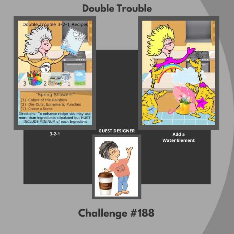 Great card, Jolanda! I especially like that the sentiment offers encouragement. Your array of colorful umbrellas is cheering, and the pup is so cute. Thanks for joining us as our Crazy Cousin and for playing along with our challenges at Double Trouble.