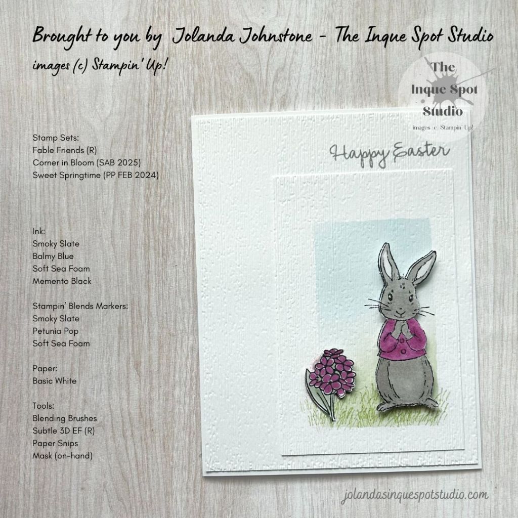 - The Bunny image from the retired Fable Friends stamp set was stamped with Memento Tuxedo Black ink as was the Flower image from the Corner in Bloom stamp set, a 2025 Sale-a-bration option, that is now retired.