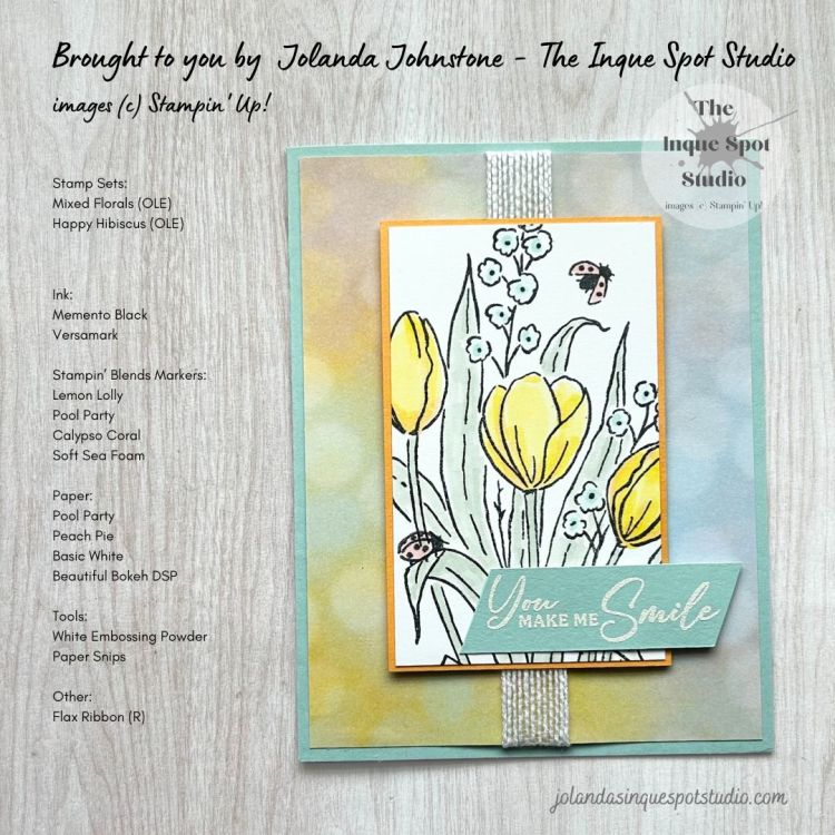 - The Tulip Floral image and the two Ladybug images from the Mixed Florals stamp set, and On-Line Exclusive product, were stamped with Memento Tuxedo Black ink and colored with Stampin’ Blends Markers. Colors chosen: Tulips – Light and Dark Lemon Lolly with a bit of Light Calypso Coral; Forget-Me-Nots – Light and Dark Pool Party; Greenery – Light Soft Sea Foam; and Ladybug Wings – Light Calypso Coral.