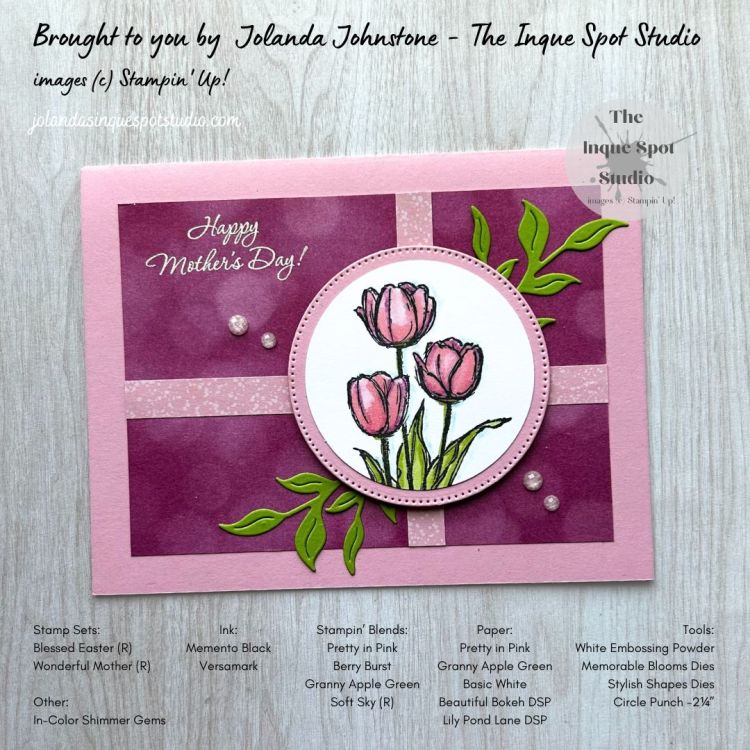 All elements were adhered to the card base to resemble the sketch. The Tulips were popped up with Dimensionals and a few newly retired Pretty in Pink 2024/2026 In-Color Shimmer Gems were added for a bit of sparkle.