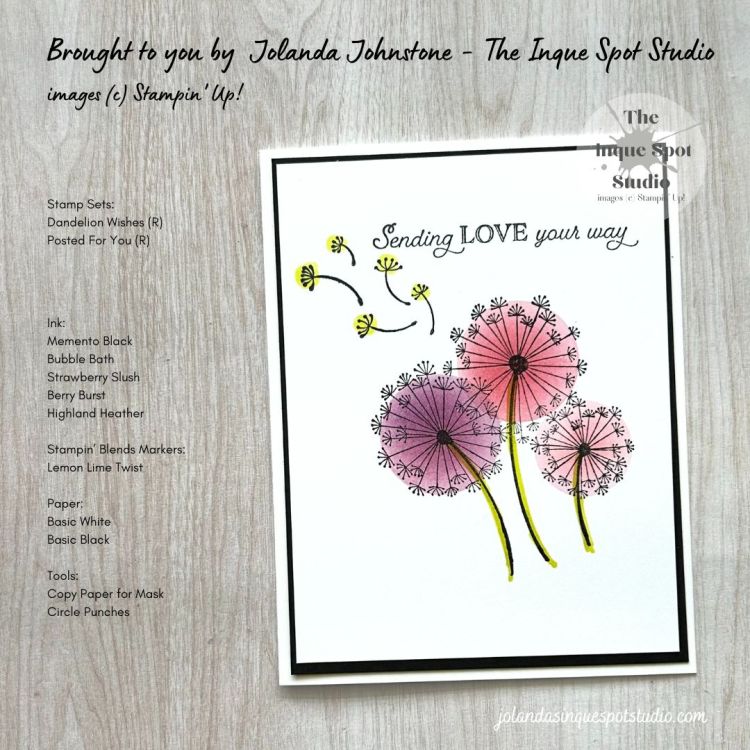 - The Triple Dandelion and Floating Seeds images from the retired Dandelion Wishes stamp set (circa 2018) were stamped with Memento Tuxedo Black ink, as was the sentiment, Sending love your way, from the retired Posted For You stamp set (circa 2020).