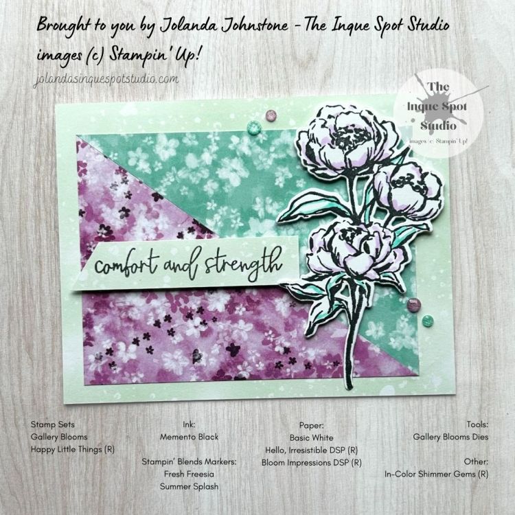 • Diagonal Split Panel: (4¾” x 3½”) Fresh Freesia Floral and Summer Splash Floral patterned pieces of paper from the 2025 Sale-a-bration Blooms Impressions Designer Series Paper pack cut on the diagonal and fitted together.