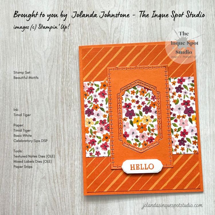 • The greeting, Hello, from the Beautiful Motifs stamp set was stamped with Timid Tiger ink and die-cut with the (1½” x ½”) Label die, also from the Mixed labels Dies set.