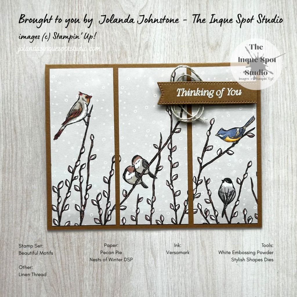 • Card Front Panels: (4” x 5”) Birds and Pussy Willows patterned piece of paper from the Nests of Winter Designer Series Paper pack cut into three pieces.