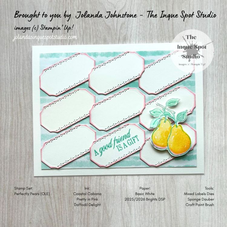 • The sentiment, A good friend is a gift, from the Perfectly Pears stamp set, an On-Line Exclusive product sneak peek available in July, was stamped onto one of the die-cuts.