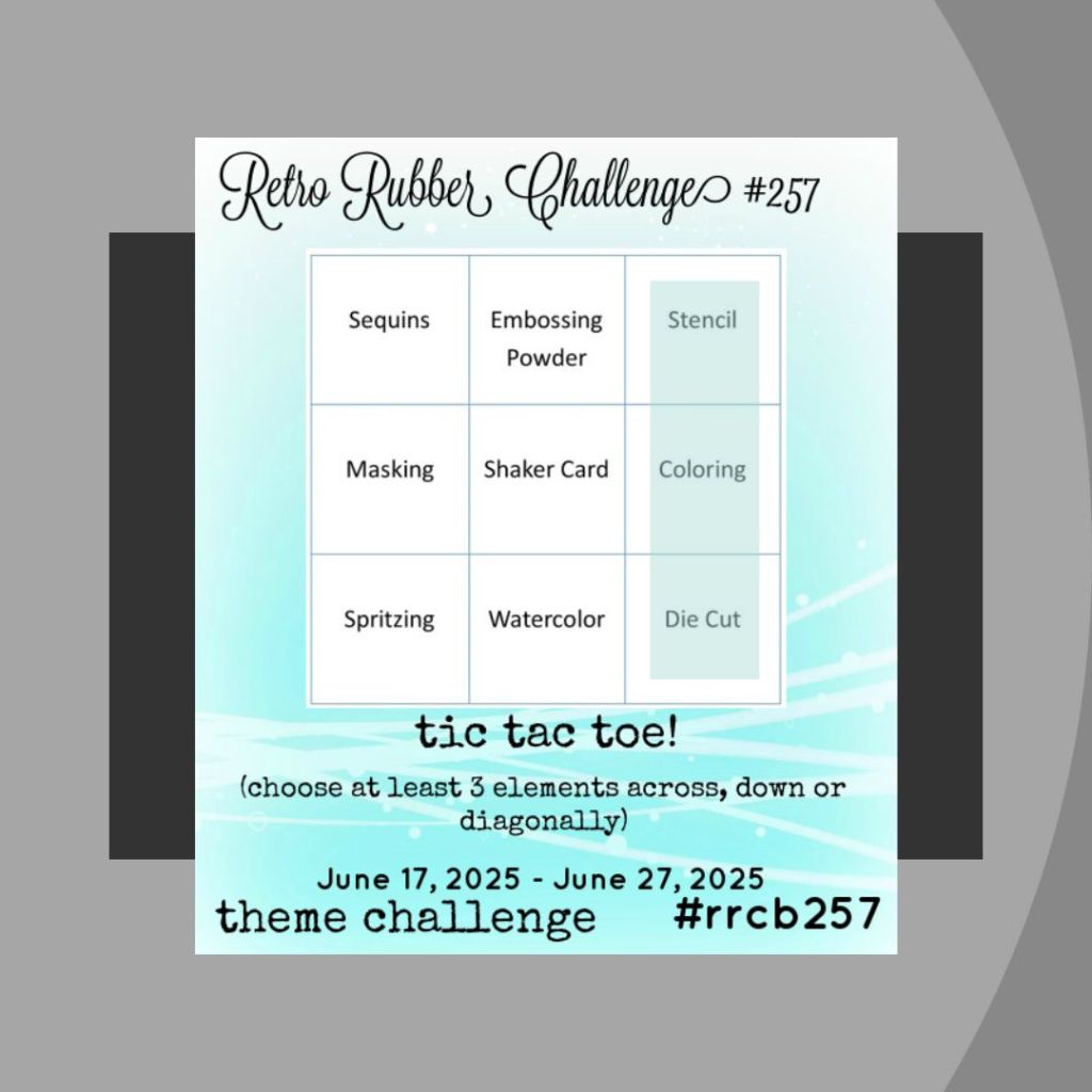 Order of the day – clean and simple for CAS on Friday (#311) with a Summer theme; Retro Rubber (#257) featuring older stamps with their Tic Tac Toe Board choices – right side: Stencil / Coloring / Die Cut(s); and sharing with Addicted to Stamps & More (#495) and their Die Cuts and / or Stencils request.