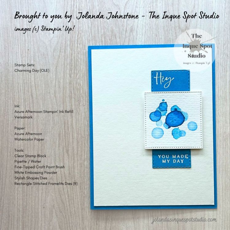 - The sentiments, Hey and You Made My Day, from the Charming Day stamp set, an On-Line Exclusive product that will be available on July 1st, was stamped with Versamark ink and heat-set with White Embossing Powder.