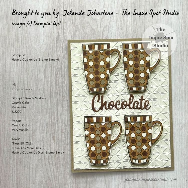 - The Spotted Mug image from the Have a Cup on Us stamp set, from Stamp Simply, was stamped with Early Espresso ink and colored with Stampin’ Blends Markers. Colors chosen: Dark Crumb Cake, Light Pecan Pie and SU200, a nice warm Brown.