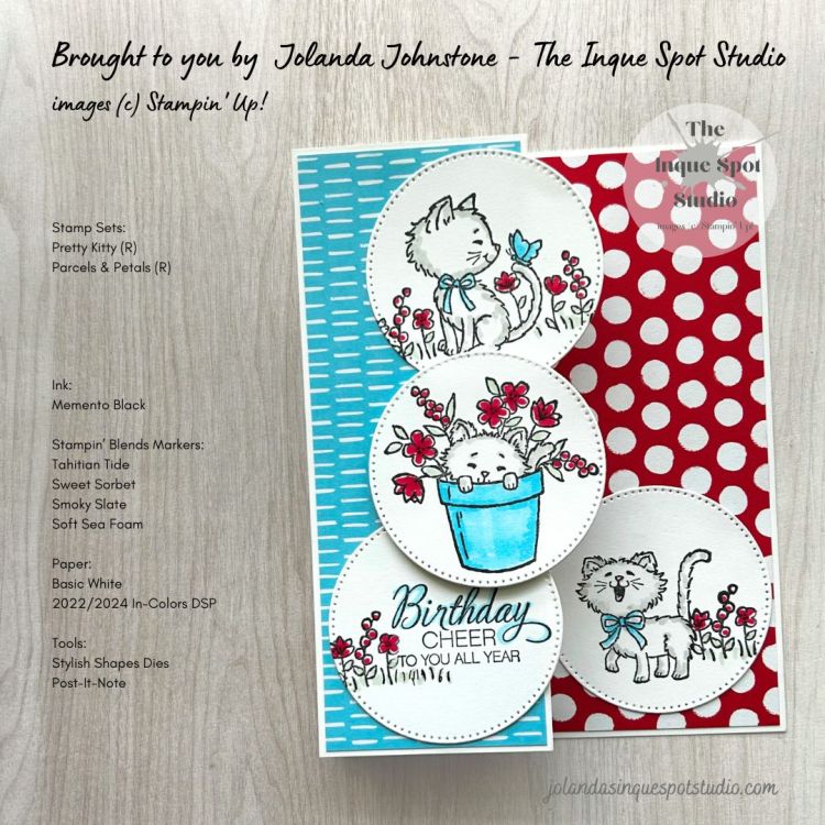 - All three Pretty Kitty images and the Sentiment were die-cut with the (2⅛”) Stitched Circle die from the Stylish Shapes Dies set.