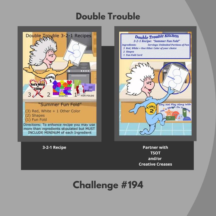 Inspiration: Double Trouble (#194) and their 3-2-1 Recipe (Red, White plus one color – Blue for 3 colors; at least 2 shapes; and try a fun fold) partnering with Try a Sketch on Tuesday (#673) and Creative Creases (#105).