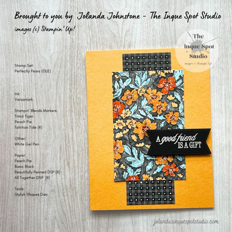- The sentiment, A good friend is a gift, from the Perfectly Pears stamp set, an On-Line Exclusive product, was stamped with Versamark ink and heat-set with White Embossing Powder and then die-cut with the (2⅛” x ⅞”) Stitched Banner die from the Stylish Shapes Dies set.