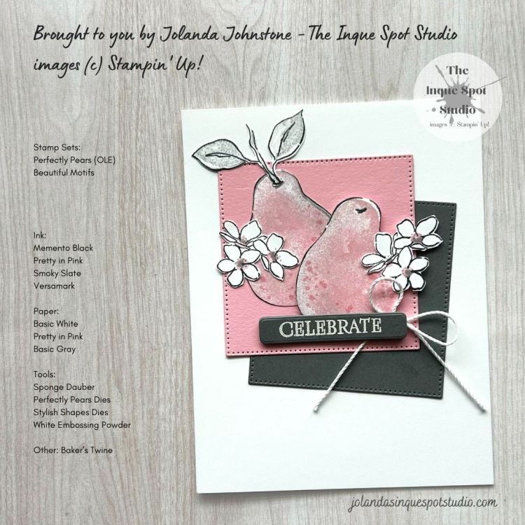- The infill, two-step stamping Pear image was stamped into Pretty in Pink ink and Smoky Slate ink was added with a Sponge Dauber.