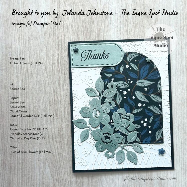 - The greeting, Thanks, from the Amber Autumn stamp set was stamped with Secret Sea ink and die-cut with the (2¼” x 1”) Stitched Arch die, also from the Everyday Arches Dies set.