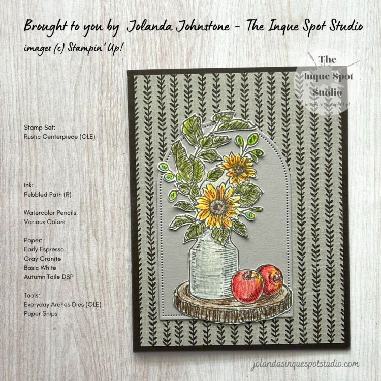 - The Sunflower and Apples image from the Rustic Centerpiece stamp set, also an On-Line Exclusive product, was stamped with retired Pebbled Path ink for a softer outline.