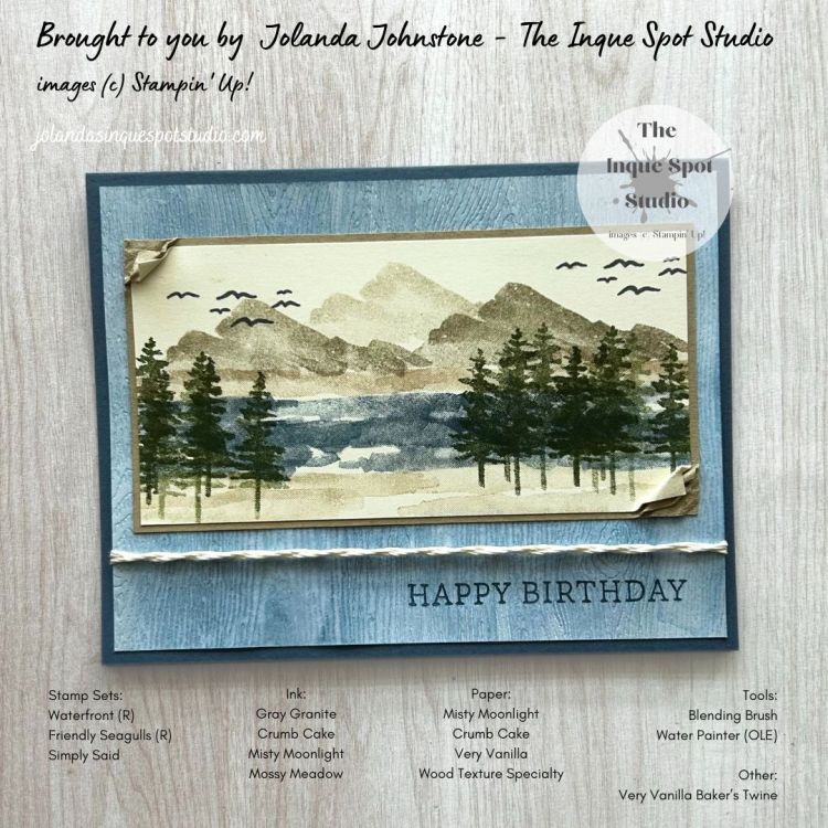 - Using the scene builder elements of the retired Waterfront stamp set, the scene was created. Elements and Ink colors: Mountains – Gray Granite; Water – Misty Moonlight, Land – Crumb Cake, Trees – Mossy Meadow.