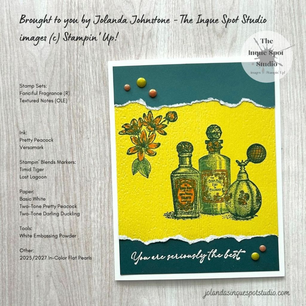 - The Flower and Perfume Bottles images from the retired Fanciful Fragrance stamp set were stamped with Pretty Peacock ink.