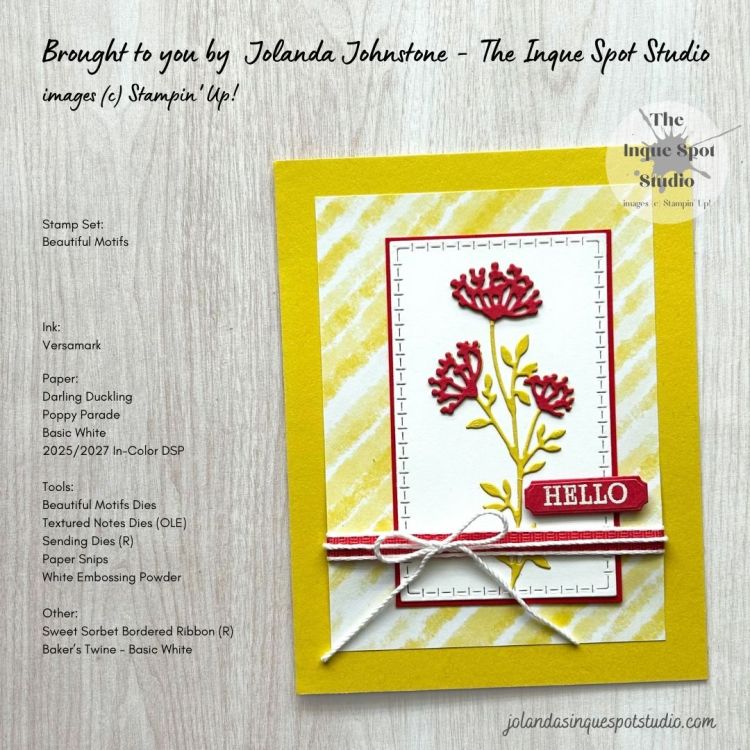 - Focal Image – Floral Stem: (1¾” x 4”) Poppy Parade and Darling Duckling cardstocks die-cut with the Floral die from the Beautiful Motifs Dies set.