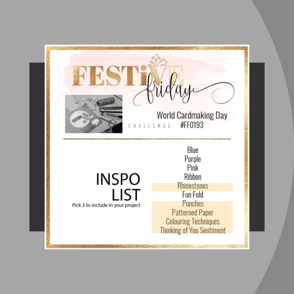 My design choices were influenced by: Festive Friday (#193) opting to use Patterned Paper, Rhinestones, Sentiment, Punch and a Coloring Technique and the Just Us Girls (#793) Mood Board for the Fall Motif and Orange Color.