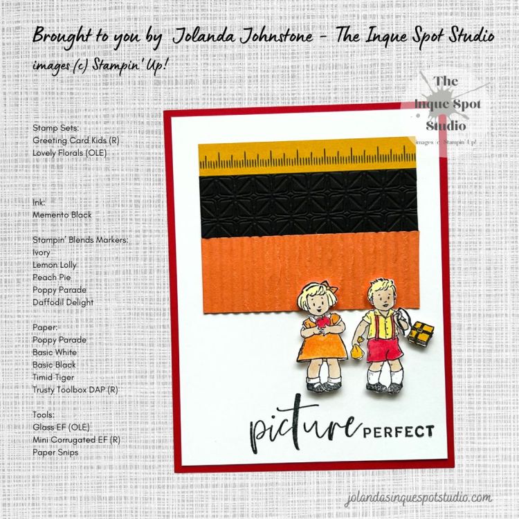 • The Schoolchildren image from the retired Greeting Card Kids stamp set was stamped with Memento Tuxedo Black ink and colored with Stampin’ Blends Markers.  Colors chosen: Skin – Ivory; Hair – Light Lemon Lolly; Dress and Hair Bow – Light Peach Pie; Shirt – Light Lemon Lolly; Shorts and Suspenders – Light Poppy Parade; Apple – Light Poppy Parade; Books and Sack – Dark Daffodil Delight.