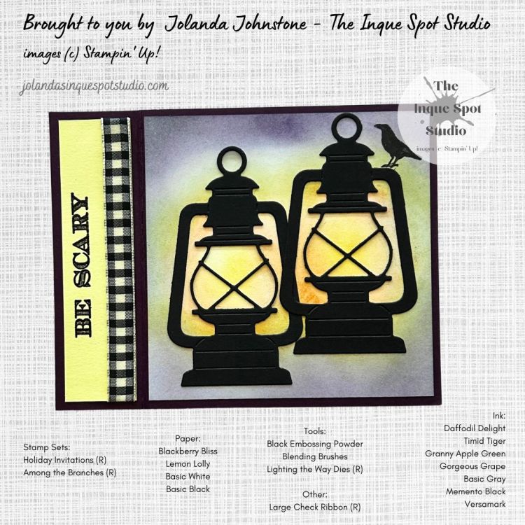 - The Raven image from the retired Among the Branches stamp set was stamped with Memento Tuxedo Black ink (after the Lantern was adhered in place).