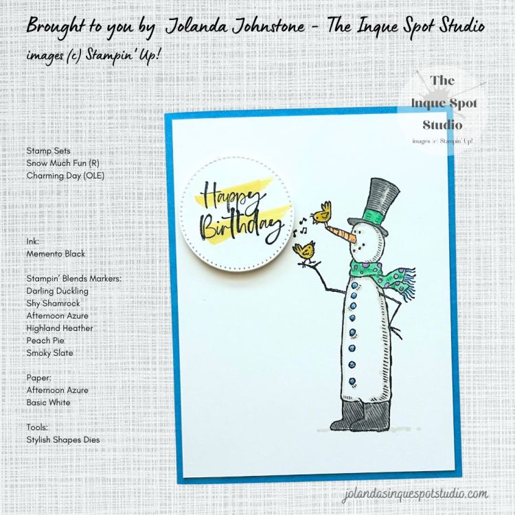 • The Snowman and Birds image from the retired Snow Much Fun stamp set was stamped with Memento Tuxedo Black ink and colored with Stampin’ Blends Markers.  Colors chosen: Birds – Light Darling Duckling; Bird Beaks and Snowman Nose – Light Peach Pie; Hat Band & Scarf – Light and Dark Shy Shamrock; Scarf Dots – Dark Highland Heather; Scarf Fringe and Buttons – Light and Dark Afternoon Azure; Hat, Boots and Shadows – Light and Dark Smoky Slate.