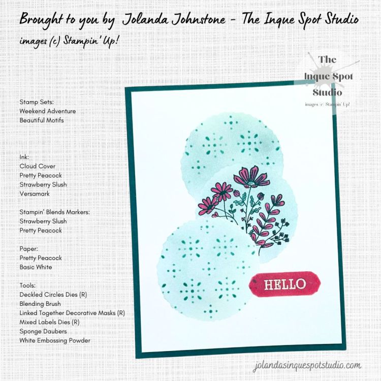 - Using both Stencil One and Mask, the Floral image from the Weekend Adventures stamp set was stamped with Pretty Peacock ink and colored with both the Light Strawberry Slush and Pretty Peacock Stampin’ Blends Markers.