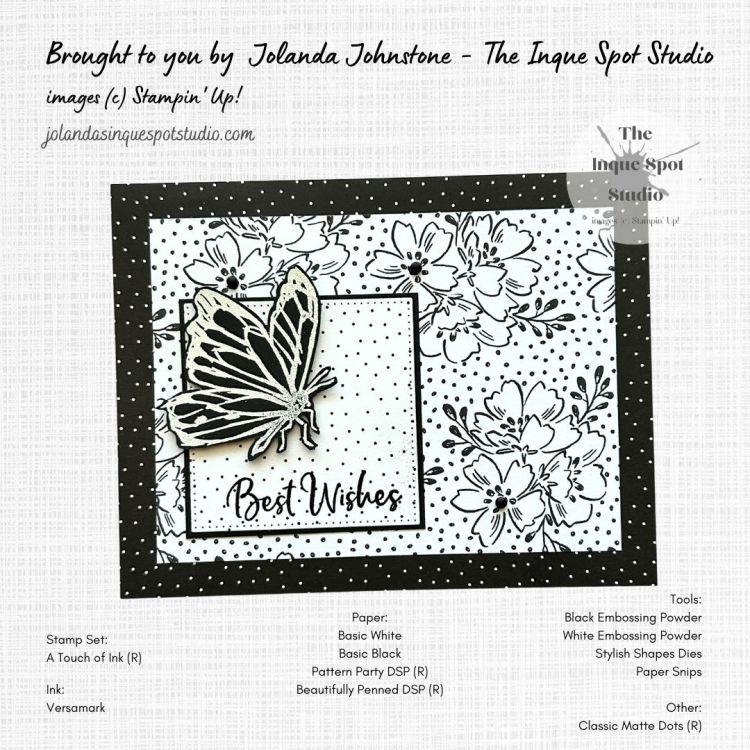 - The sentiment, Best Wishes, from the retired A Touch of Ink stamp set was stamped with Versamark ink and heat-set with Black Embossing Powder.