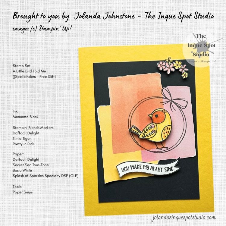 - The Bird image was colored with Stampin’ Blends Markers. Colors chosen: Light and Dark Daffodil Delight and Timid Tiger with Dark Pretty in Pink and then fussy-cut with Paper Snips.