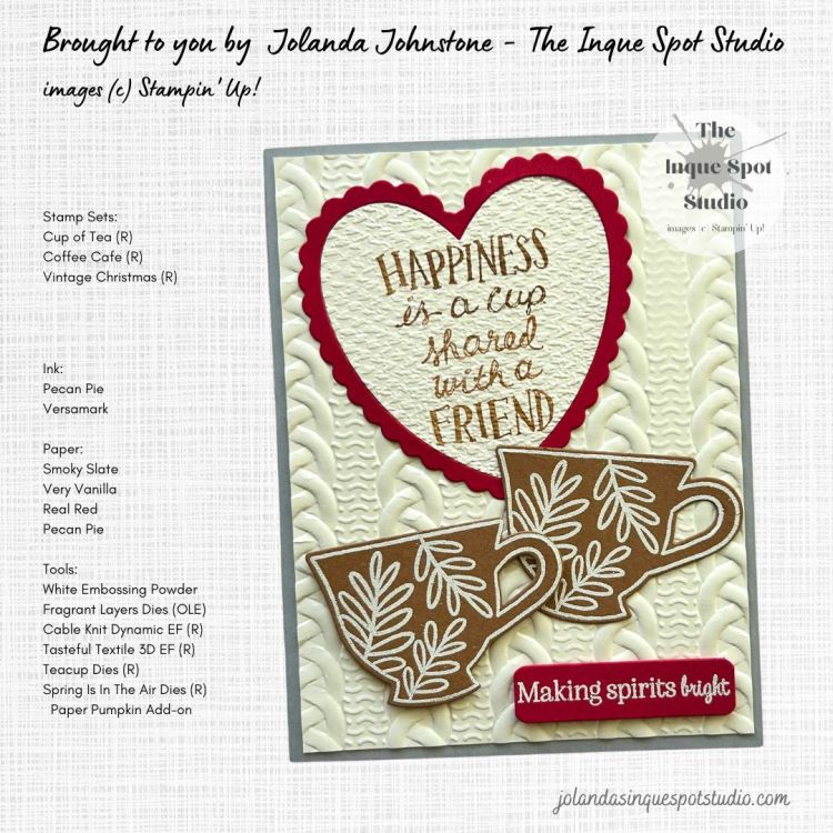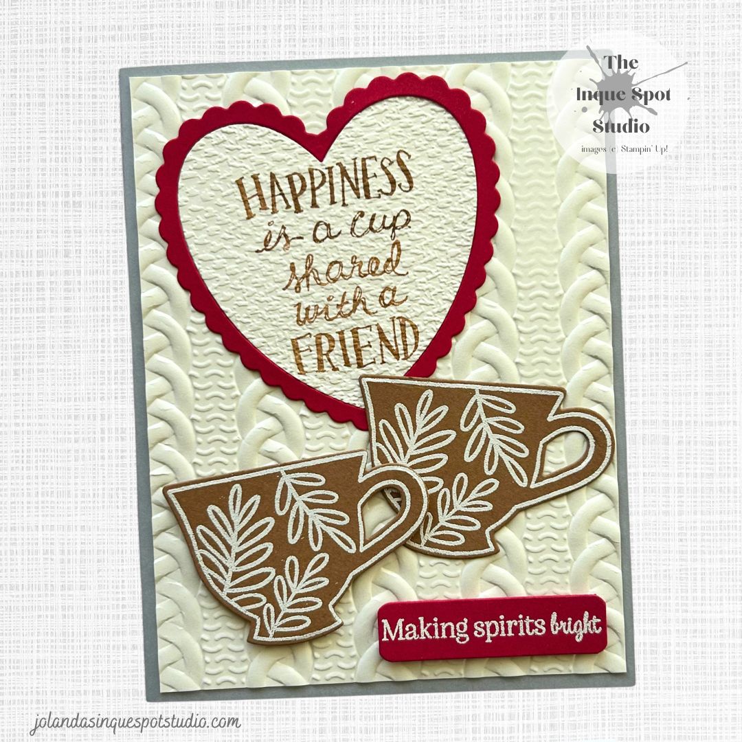 All elements were adhered to the card base. The Sentiment Heart was framed with the Real Red Scalloped Heart and both the top Tea Cup and the Holiday Sentiment were popped up with Dimensionals.