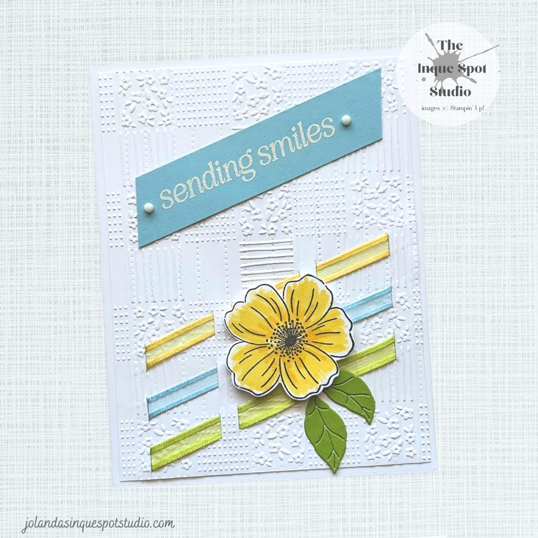 - From the retired Organdy Ribbon Combo Pack, Daffodil Delight, Balmy Blue and Lemon Lime Twist ribbons were threaded through the slits to create the block pattern.