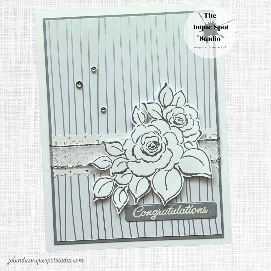 - Accent Mat: (3⅞” x 5⅛”) Brushed Silver cardstock (retired but still in my stash).