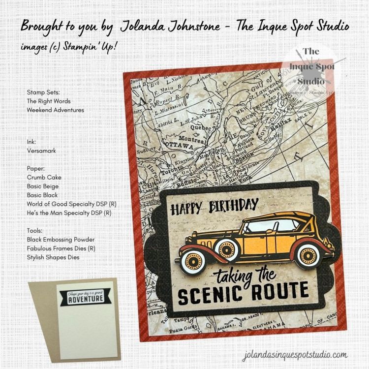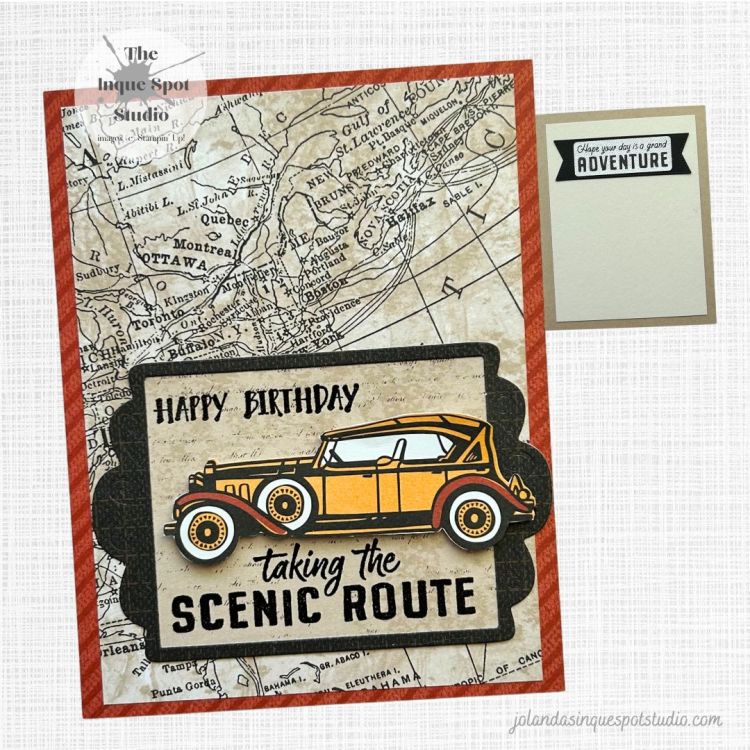 - The sentiment, Happy Birthday, from The Right Words stamp set and the sentiment, Taking the Scenic Route, from the Weekend Adventure stamp set were stamped with Versamark ink and heat-set with Black Embossing Powder.
