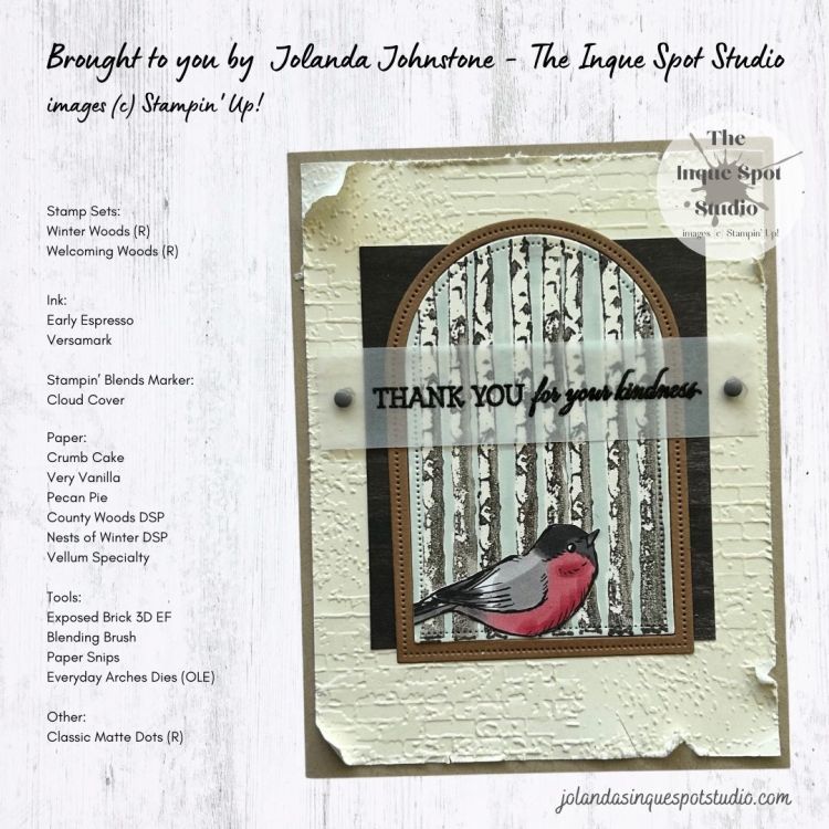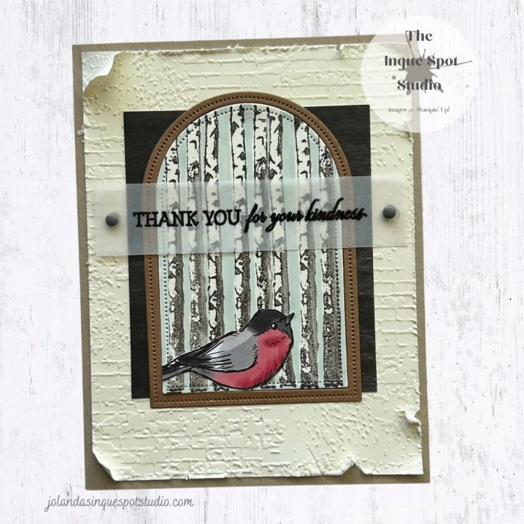 - The sentiment, Thank you for your kindness, from the retired Welcoming Woods stamp set was stamped with Versamark ink and heat-set with Black Embossing Powder.