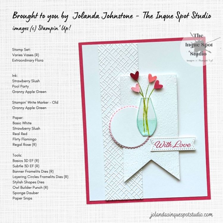 - The sentiment, With Love, from the Extraordinary Flora stamp set was stamped with Strawberry Slush ink and die-cut with the Small Stitched Banner die from the Stylish Shapes Dies set.