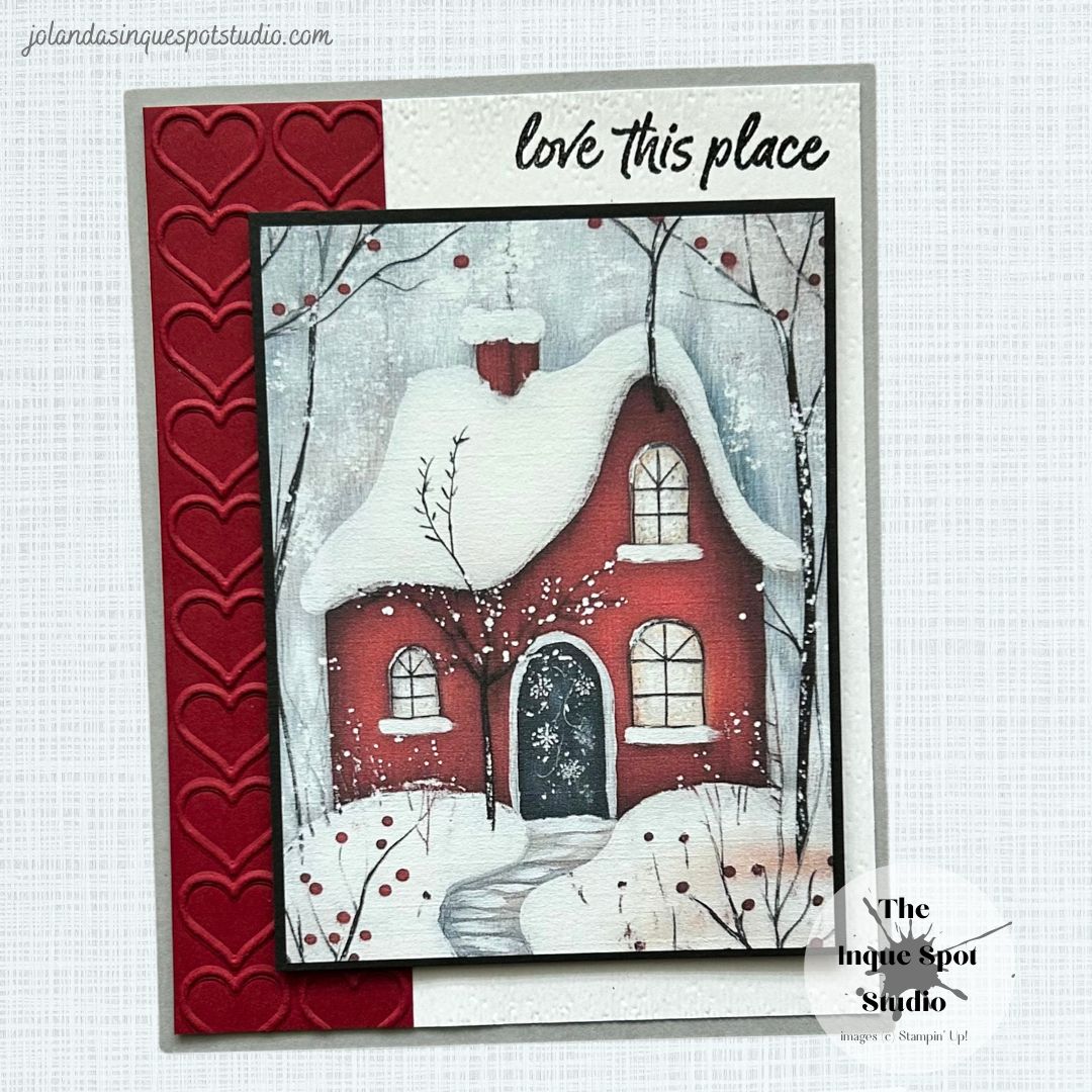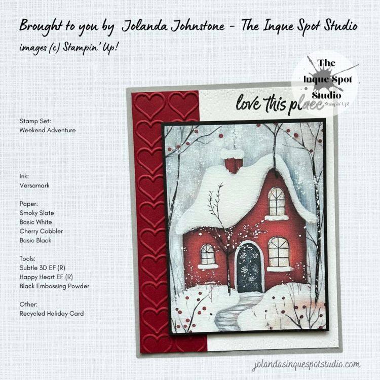 - The sentiment, love this place, from the Weekend Adventure stamp set was stamped with Versamark ink and heat-set with Black Embossing Powder and then dry-embossed with the retired Subtle 3D Embossing Folder.