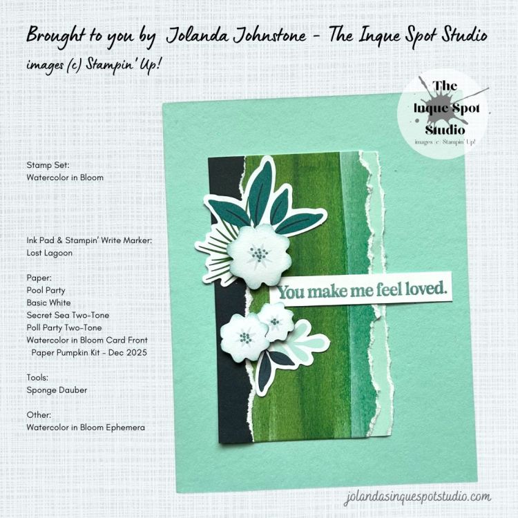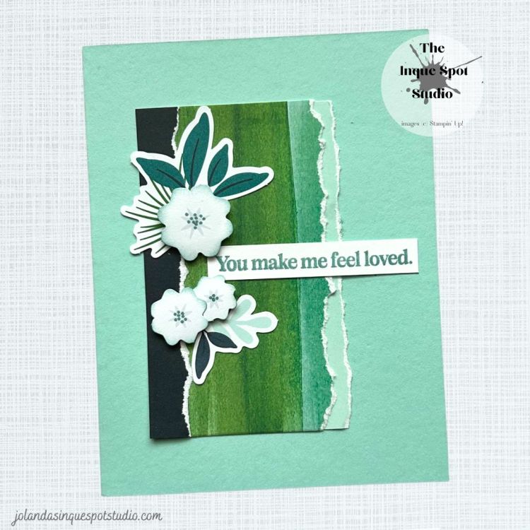 - The sentiment, You make me feel loved, from the Watercolor in Bloom stamp set was also stamped with Lost Lagoon ink and trimmed to (2⅝” x ⅜”).