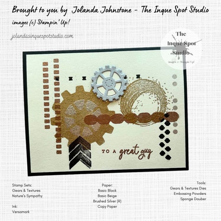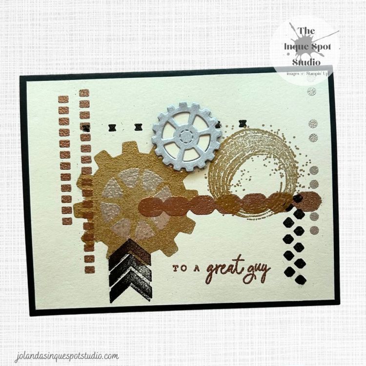 - Adding stamped Elements from the Gears & Textures stamp set stamped with Versamark ink and heat-set: Triple Arrow – Black Embossing Powder and Inky Swirl – Gold Embossing Powder.