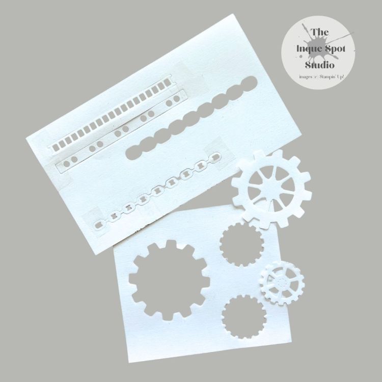 - Using various dies from the Gears & Textures Dies set, stencils were created.
